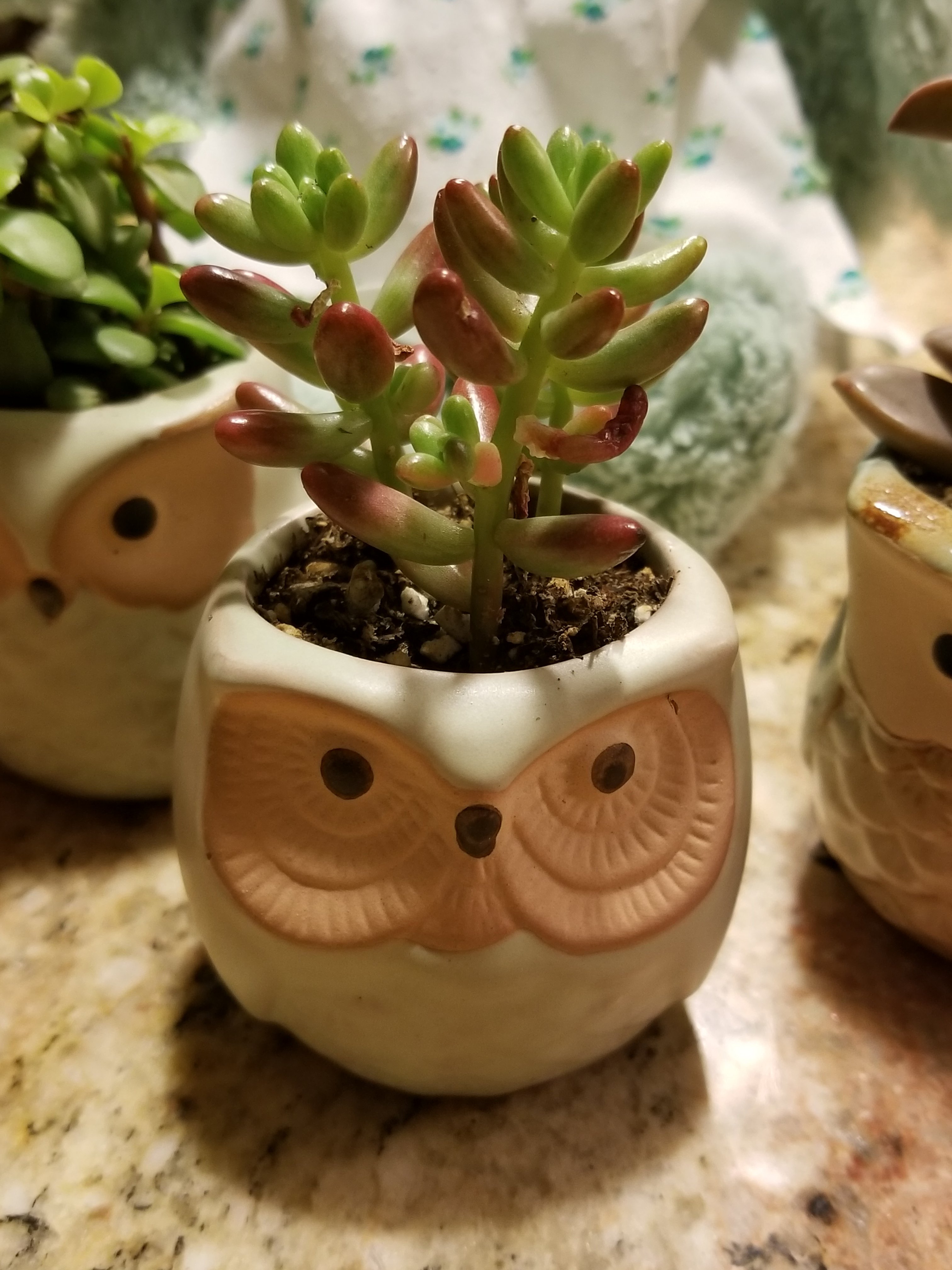 The owl plant pots came from Amazon. They were a holiday gift. What a sweet thing to send! Two favorite things around here are owls and any kind of a plant to take care of. The pots are ceramic and about three inches tall by about two inches wide. It was originally a set of six but one was broken on arrival.